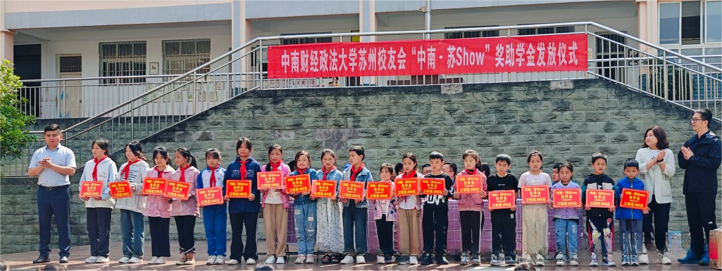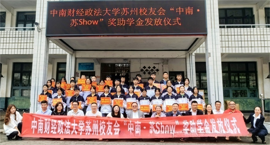 7日下午,在鹽津縣中和鎮艾田中學,舉行了中南財經政法大學蘇州校友會“中南 蘇Show”獎助學金發放儀式,18名中學生獲獎。